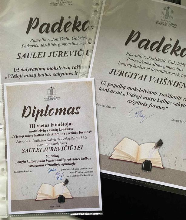 Konkurse dalyvavo dvi Joniškėlio Gabrielės Petkevičaitės-Bitės gimnazijos mokinės – Ema Kazlauskaitė (7a) ir Saulė Jurevičiūtė (IIa). Abi mergaitės rašė darbus, kuriuose nagrinėjo anglų kalbos įtaką jaunimo kalbai.